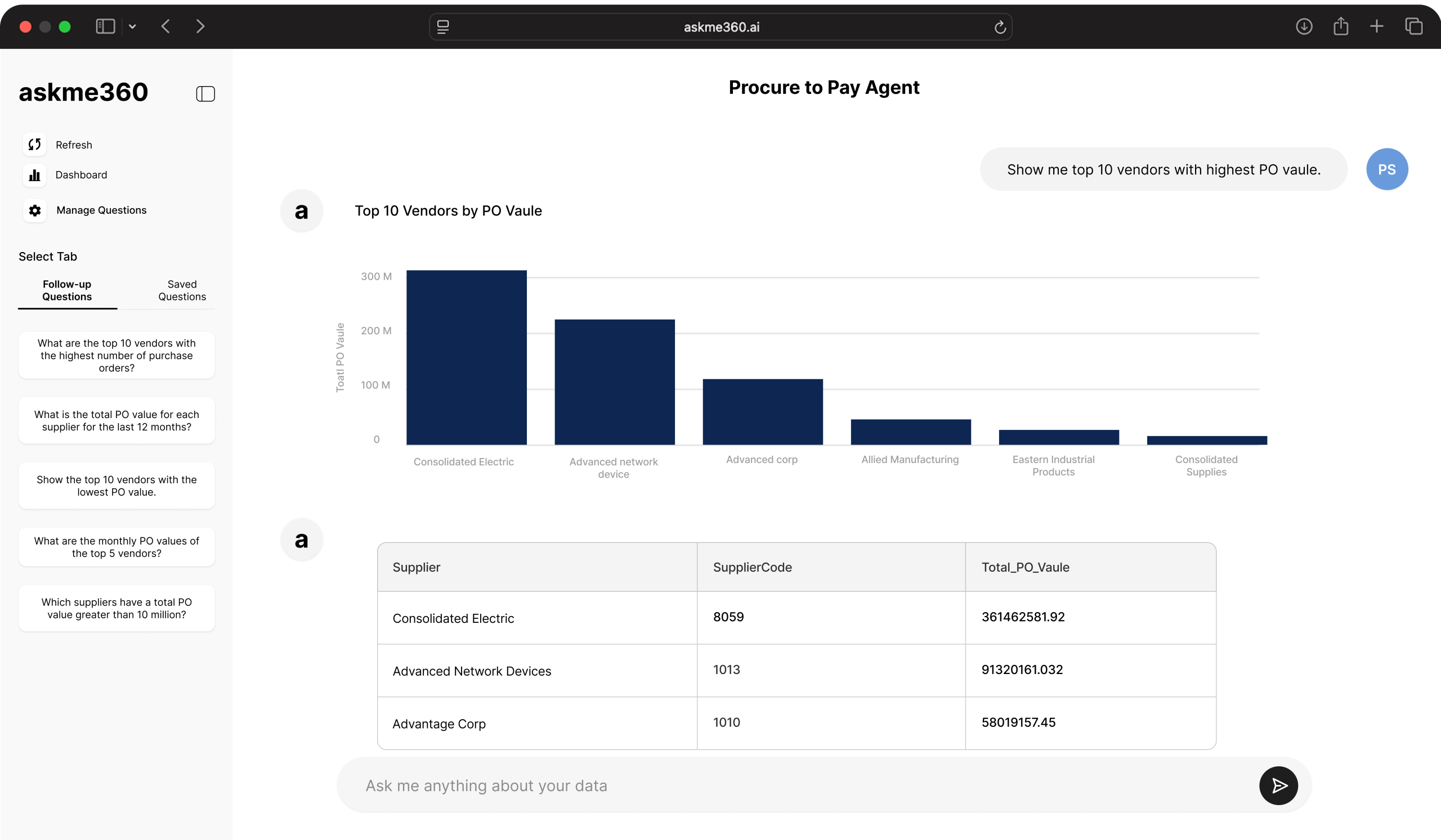 askme360 makes analyzing enterprise data effortless. Just ask your question – get instant, secure answers and dashboards. No more waiting, no more complexity, no junk responses because these are enterprise agents trained with your data!